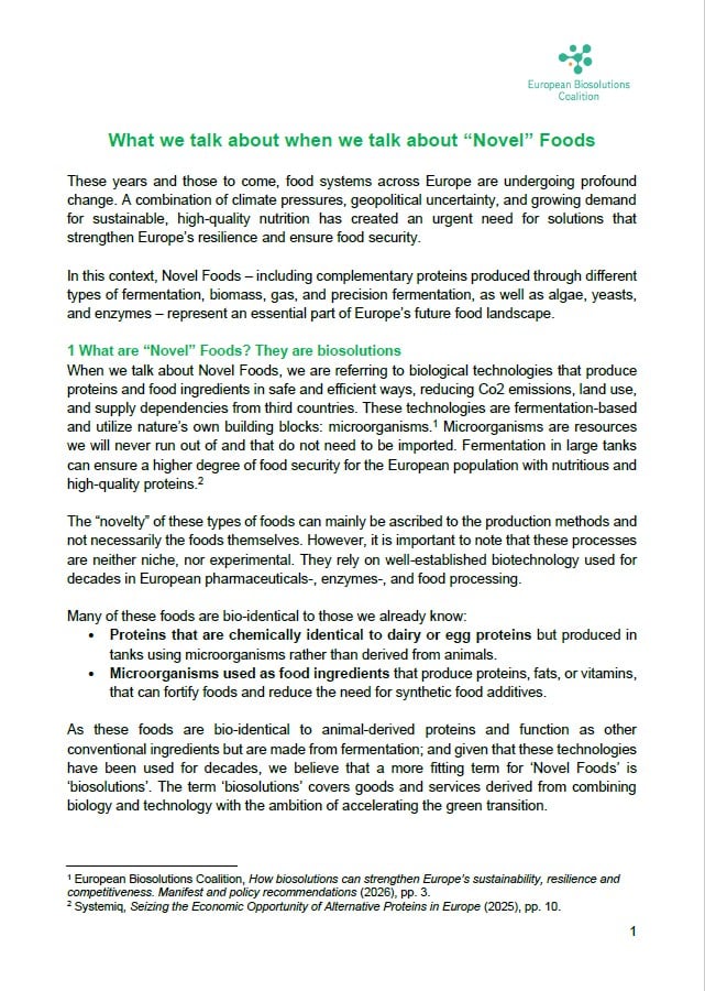 We explain how these biosolutions function as complementary proteins, supporting and strengthening Europe’s existing agricultural production rather than replacing it, while also reducing land use, emissions, and dependence on imported inputs. The explainer also highlights the broader economic and strategic relevance of Novel Foods, including their potential to drive green re‑industrialisation, create jobs across the value chain, and contribute to more resilient, future‑ready European food systems.